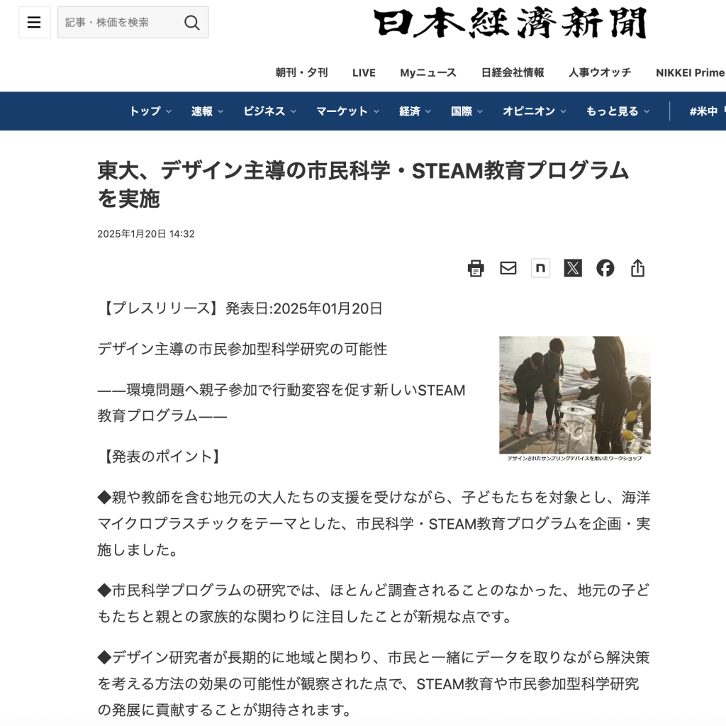 日本経済新聞に左右田が第一著者として書いたOMNIマイクロプラスチックのこども研究員に関する論文が、Q1レベルの国際学術雑誌であるCitizen Science Theory and Practiceに記事の発表の内容が掲載されました。